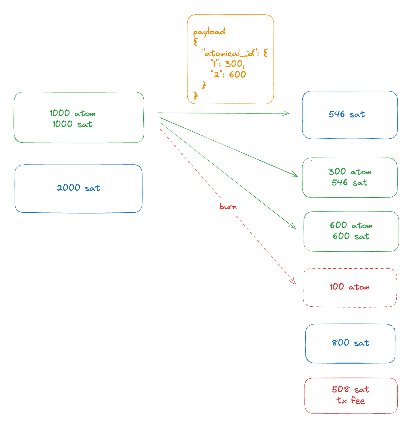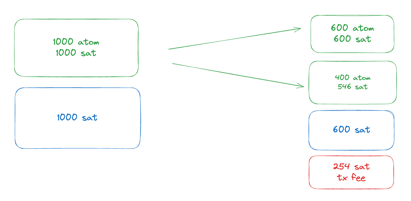 <table><thead><tr><th>Input/Output</th><th width="249">Satoshis</th><th>Atomicals</th></tr></thead><tbody><tr><td>vin:0</td><td>1000</td><td>1000 ATOM</td></tr><tr><td>vin:1</td><td>9900</td><td>0 ATOM</td></tr><tr><td>vout:0</td><td>900</td><td>900 ATOM</td></tr><tr><td>vout:1</td><td>10000</td><td>100 ATOM</td></tr></tbody></table>