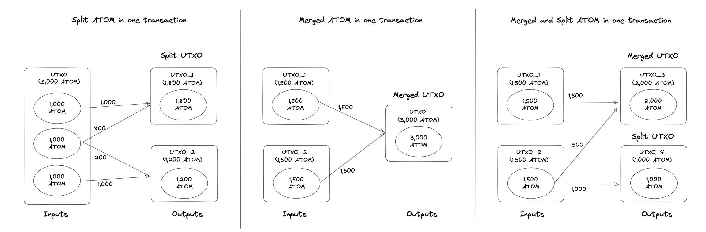 以下是一个示例,解释了在一笔交易中拆分和合并ATOM时会发生什么。