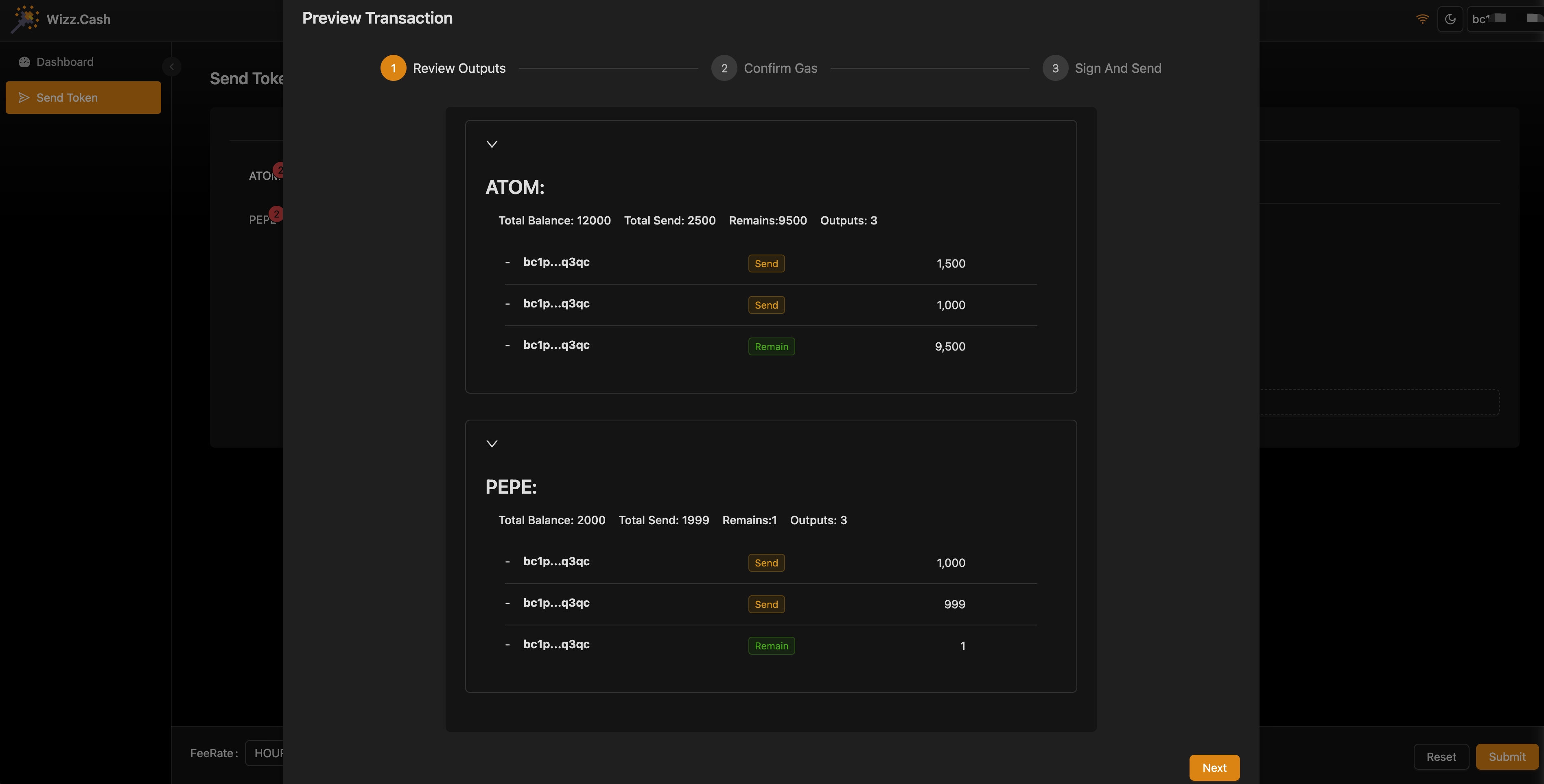 2. 为了确保在转账过程中您的资产安全，钱包已识别了Ordinals和ARC-20资产，以防止atomiclas资产被当成gas消耗。